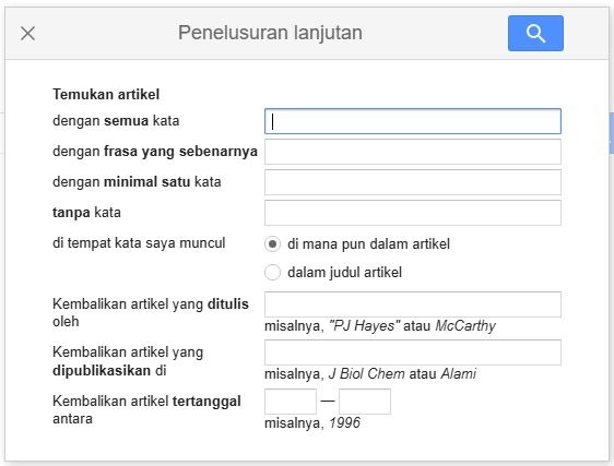 Tahap berikutnya, adalah klik ikon tiga garis horizontal di pojok kanan atas. Maka akan ada menu Advanced Research atau Penelusuran Lanjutan. Jika di klik, maka akan muncul jendela yang berisi beberapa kolom untuk diisi.