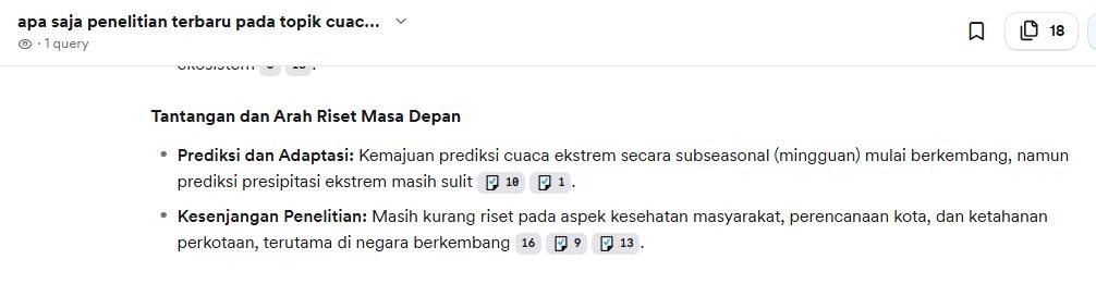 Misalnya jika mengetik prompt “apa saja penelitian terbaru pada topik cuaca ekstrim” maka respon platform ini akan seperti gambar di bawah ini dimana ada poin yang memaparkan research gap-nya sekaligus: