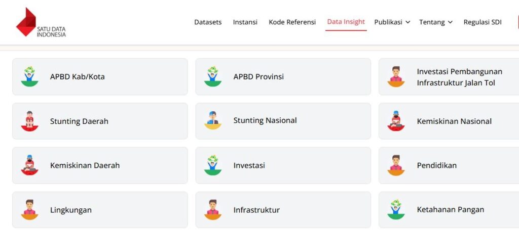 Contoh datanya seperti data stunting, data kemiskinan, data infrastruktur, data ketahanan pangan, dan sebagainya. Website resmi SDI bisa diakses melalui tautan berikut https://data.go.id/data-insight.