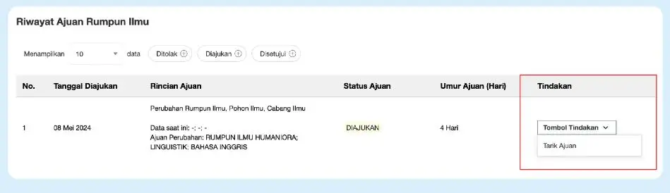- Pada bagian Riwayat Ajuan Rumpun Ilmu, klik “Tombol Tindakan”, pilih “Tarik Ajuan”.