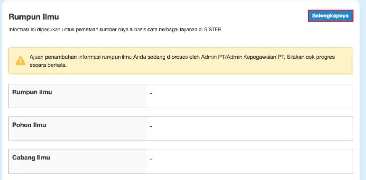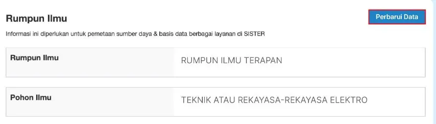Rumpun ilmu menjadi jenis data yang wajib diisi, dimutakhirkan, dan dipadankan dosen di akun SISTER. Hal ini sejalan dengan pengumuman terbaru dari Kemendikbudristekdikti di masa peralihan.