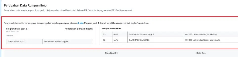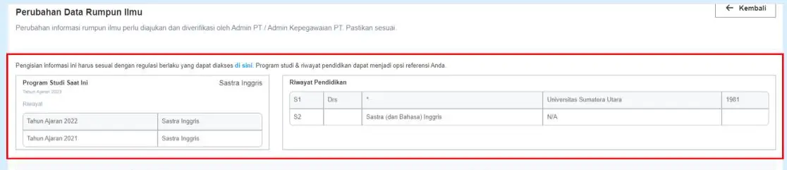 - Anda masuk ke menu Perubahan Data Bidang Ilmu. Anda dapat melihat program studi dan riwayat pendidikan yang dapat menjadi opsi referensi Anda.
