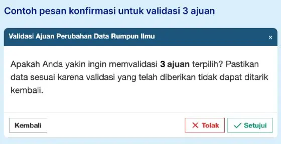 - Setelah berhasil melakukan validasi dengan menolak ataupun menyetujui ajuan Rumpun Ilmu Dosen, maka akan muncul notifikasi sebagai berikut.
