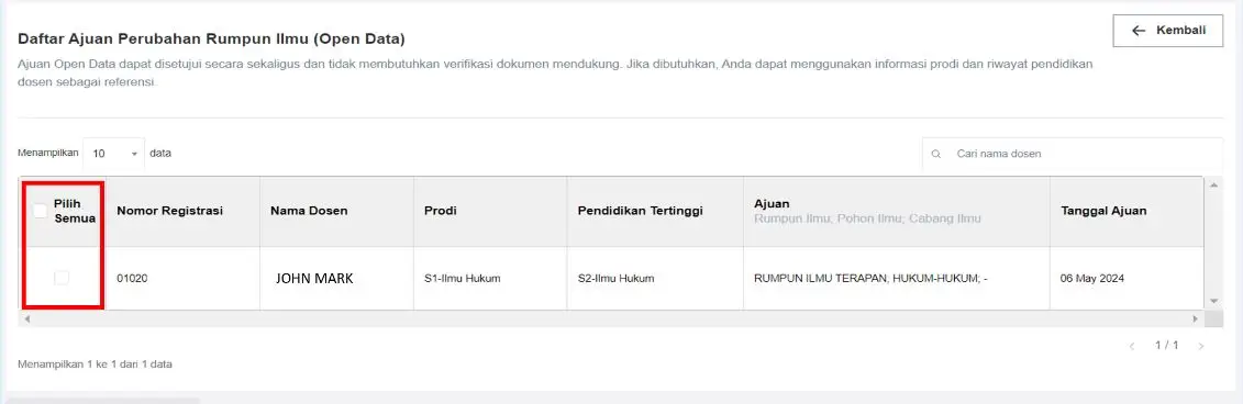 Nama Dosen yang telah divalidasi akan otomatis hilang dari tabel daftar ajuan perubahan Rumpun Ilmu di akun Admin PT ataupun Admin Kepegawaian.