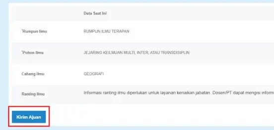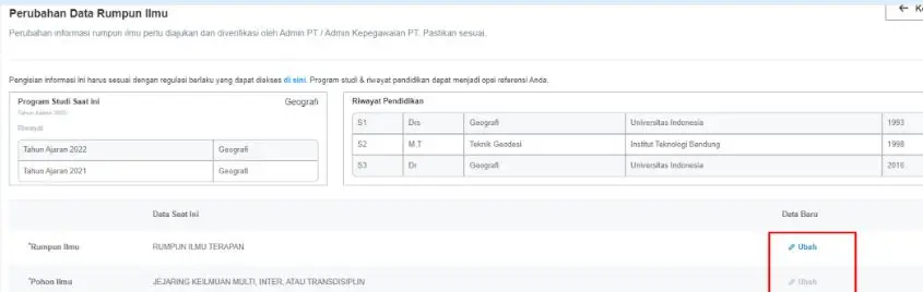 Selain bisa menarik pengajuan isi data rumpun ilmu, dosen juga bisa mengubah data rumpun ilmu yang sudah tervalidasi oleh admin PT. Berikut langkah-langkahnya:
