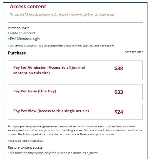 Pada closed access journal, pembaca yang hendak membuka dokumen artikel ilmiah akan mendapat notifikasi harus melakukan pembayaran. Sebagai contoh adalah akses di  jurnal American Journal of Public Health (AJPH).