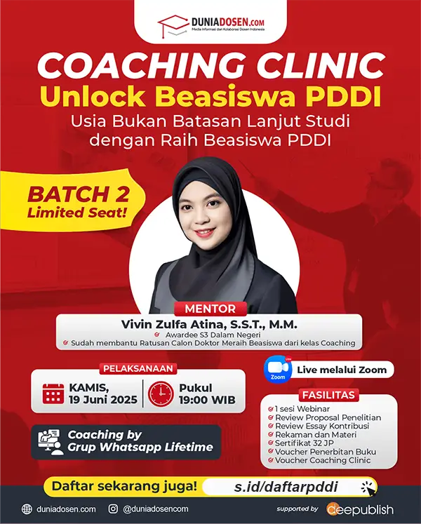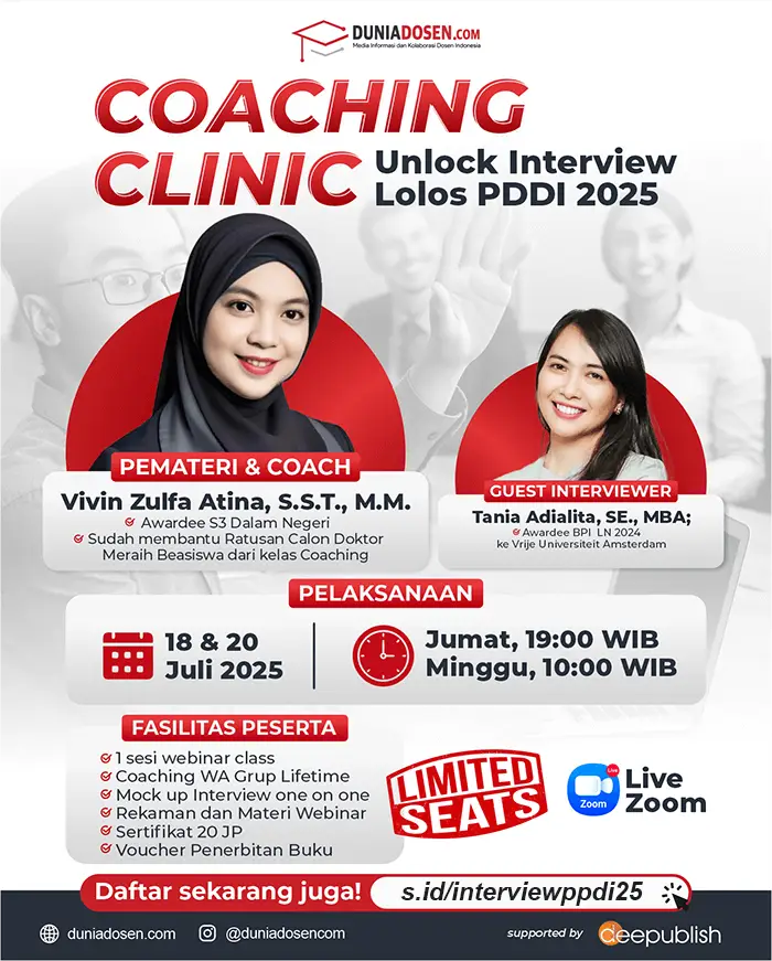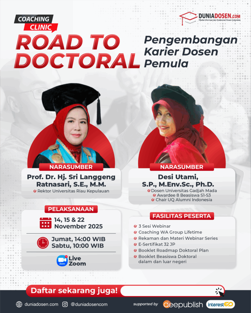 Dunia Dosen selalu mengadakan webinar seputar peningkatan karir dan pelaksanaan tridharma perguruan tinggi setiap bulan. Bagi Anda yang membutuhkan arahan, penjelasan, dan mendapatkan solusi dari ahli, jangan lewatkan informasi webinar melalui laman Homepage dan media sosial resmi Instagram @duniadosencom!