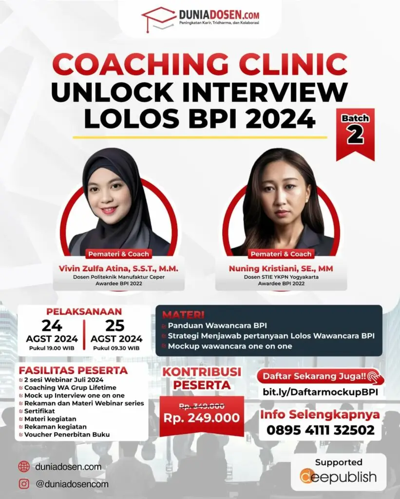Dunia Dosen selalu mengadakan webinar seputar peningkatan karir dan pelaksanaan tridharma perguruan tinggi setiap bulan. Bagi Anda yang membutuhkan arahan, penjelasan, dan mendapatkan solusi dari ahli, jangan lewatkan informasi webinar melalui laman Event dan media sosial resmi Instagram @duniadosencom!