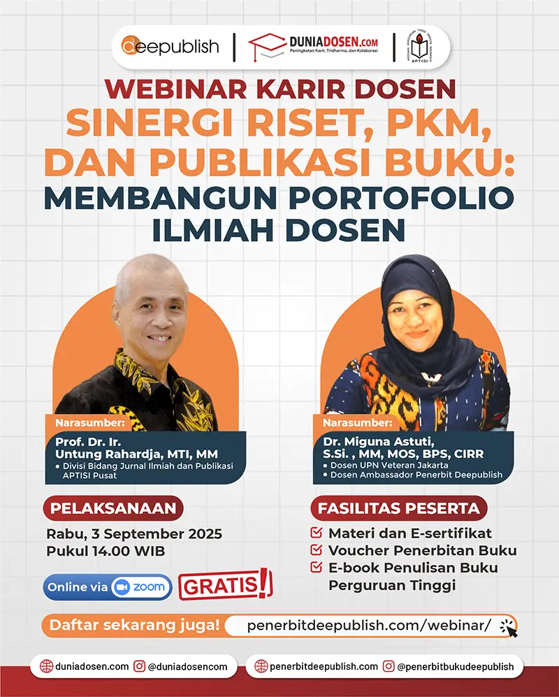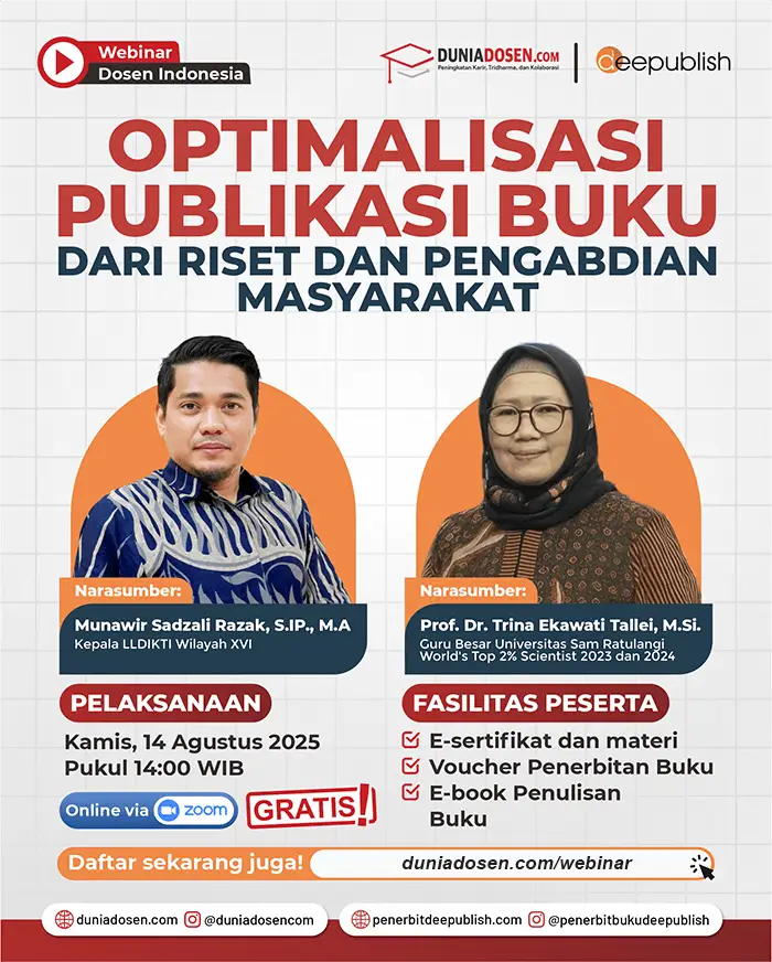 Duniadosen selalu mengadakan webinar seputar peningkatan karir dan pelaksanaan tridharma perguruan tinggi setiap bulan. Bagi Anda yang membutuhkan arahan, penjelasan, dan mendapatkan solusi dari ahli, jangan lewatkan informasi webinar melalui laman Homepage dan media sosial resmi Instagram @duniadosencom!