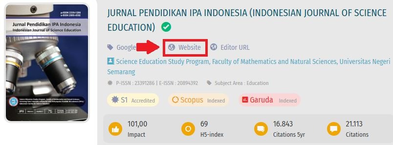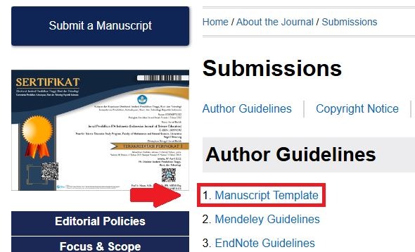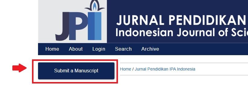 - Jika sudah masuk ke website resmi jurnal tujuan, maka tinggal mencari menu template artikel ilmiah yang ditetapkan. Template ini adalah format penulisan artikel jurnal terindeks SINTA tersebut. Sebagai contoh, pada jurnal “Jurnal Pendidikan IPA Indonesia”. Menu template artikel ada di tombol “Submit a Manuscript”.