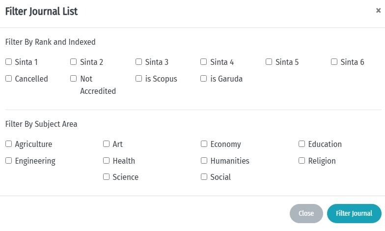 - Selanjutnya, silahkan cari nama jurnal dengan mengetik di kolom yang disediakan. Jika ingin lebih cepat, manfaatkan fitur “Filter” untuk mencari berdasarkan bidang keilmuan atau aspek lain sesuai kebutuhan.