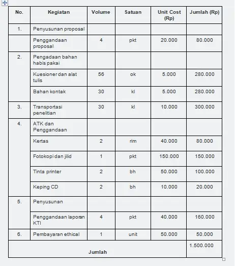 Contoh di atas adalah salah satu contoh susunan anggaran penelitian. Setiap dosen bisa mencantumkan jenis biaya yang berbeda dengan jumlah nominal yang disesuaikan di daerah atau tempat masing-masing.