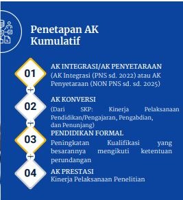 AK Kumulatif merupakan penjumlahan dari AK Konversi (hasil penilaian SKP – Sasaran Kinerja Pegawai), AK Prestasi (angka kredit penelitian), AK Pendidikan Formal (ijazah pendidikan formal dosen), AK Integritas untuk dosen PNS atau AK Penyetaraan untuk dosen non-PNS.