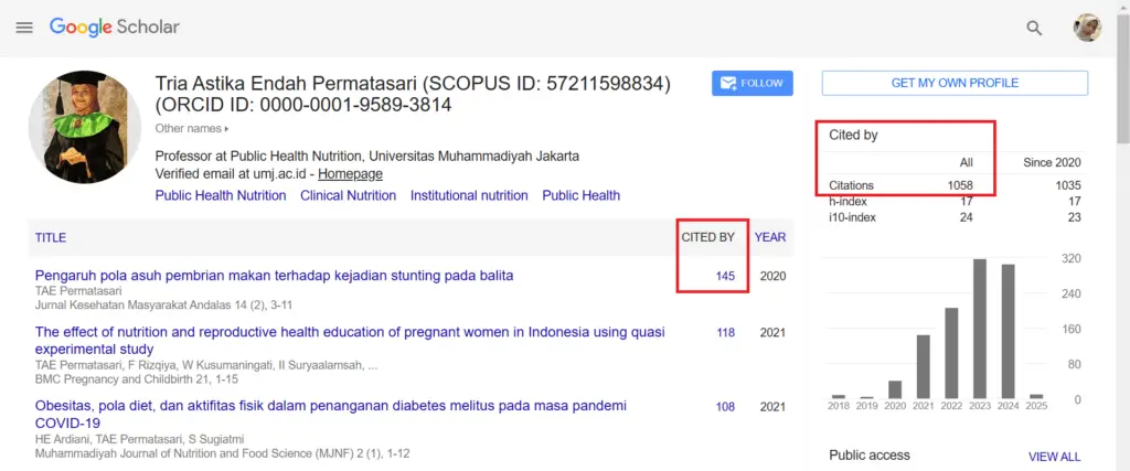 - Klik profil yang Anda cari. Lalu, Anda bisa melihat jumlah sitasi seperti pada gambar berikut