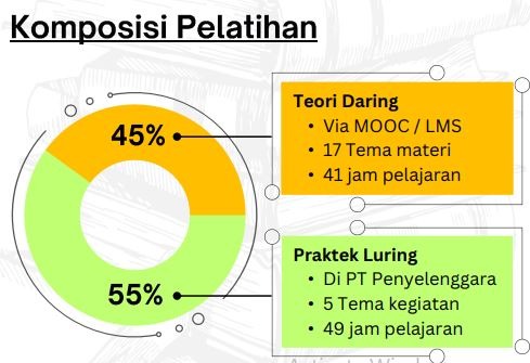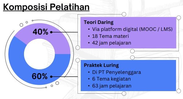 PEKERTI AA yang diselenggarakan secara blended learning juga diatur komposisinya oleh Kemdiktisaintek. Dalam program PEKERTI, kelas daring sekitar 40% dan sisa di 60% diisi dengan kelas luring. Sementara pada program AA, kelas daring 45% dan luring sebesar 55%. Berikut ilustrasinya: