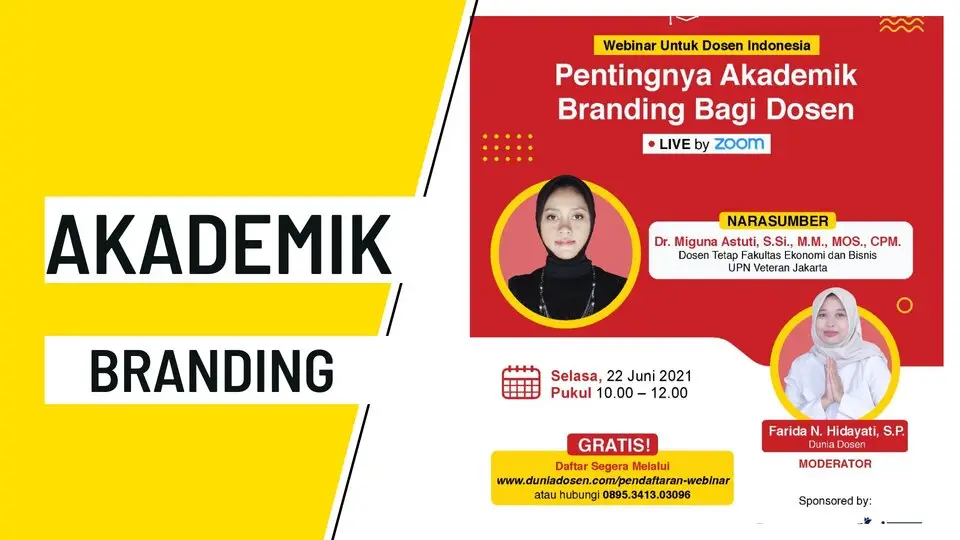 Memahami pentingnya akademik branding bagi dosen, maka Dunia Dosen menggelar webinar dengan tema Pentingnya akademik Branding bagi Dosen. Webinar yang digelar secara daring pada Selasa, 22 Juni 2021 tersebut menghadirkan narasumber Dr. Miguna Astuti, S.Si., M.M., MOS., CPM. yang merupakan salah satu dosen di Fakultas Ekonomi Universitas Pembangunan Jakarta.