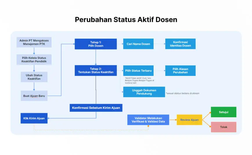 Secara umum, perubahan status aktif dosen ke status lain sesuai penjelasan sebelumnya adalah dari admin perguruan tinggi atau admin PT.
