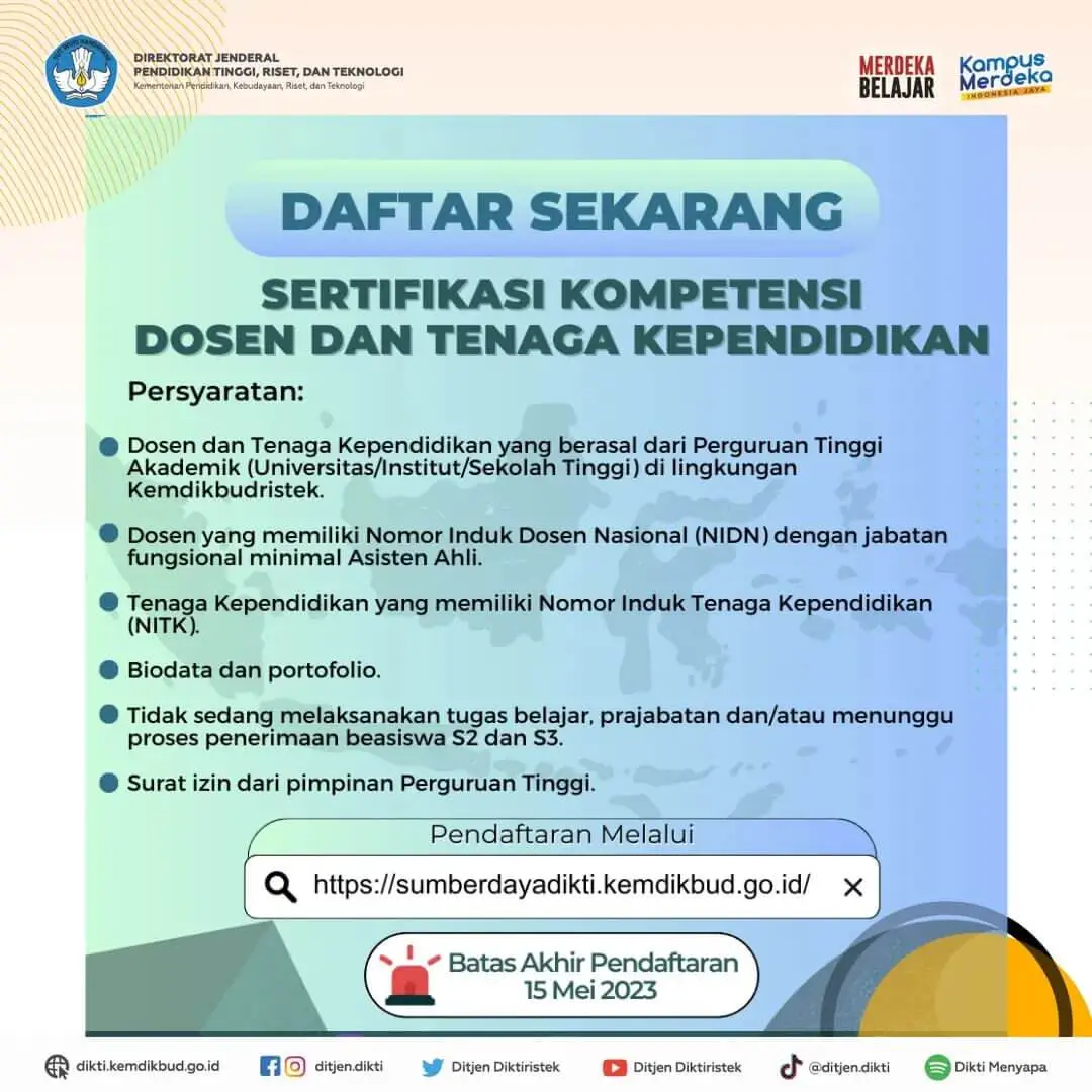 Jadi, bagi para dosen dan tenaga kependidikan yang merasa memenuhi syarat sesuai penjelasan di atas. Silahkan segera mendaftarkan diri dalam Program Sertifikasi Kompetensi Dosen dan Tenaga Kependidikan 2023 tersebut.