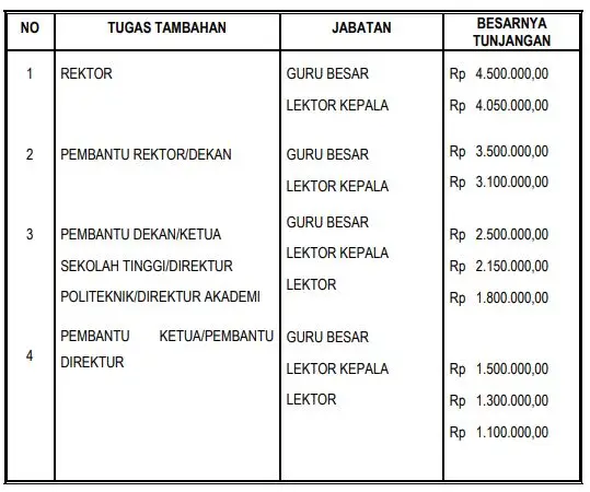 Meskipun tidak semua tugas tambahan diberi tunjangan. Namun dengan memangku salah satunya, maka dosen bisa mendapat tambahan penghasilan setiap bulan. Dikutip dari Website Universitas Gadjah Mada (UGM), berikut besaran tunjangan tugas tambahan: