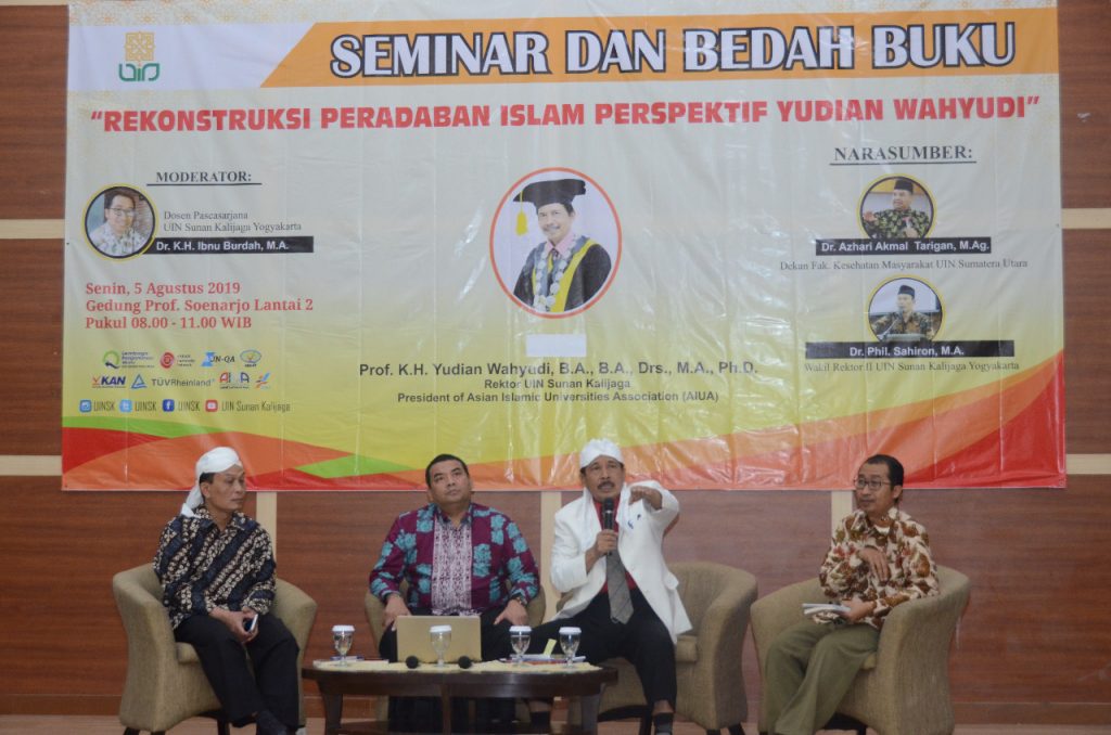Yogyakarta – Buku Rekontruksi Peradaban Islam Perpektif Prof. K.H. Yudian Wahyudi., B.A., B.A., Drs., M.A., Ph.D., dibedah oleh dua narasumber. Karya terbaru tersebut diulas dalam seminar di Convention Hall lantai 2, UIN Sunan Kalijaga (SUKA) Yogyakarta, Senin (5/8/2019).
