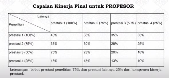 Dimana paling sedikit, dosen bisa menerima 10% Tunjangan Kinerja Prestasi (yakni dari Kategori 4 sebesar 25% dari total Tunjangan Kinerja Prestasi 40%). Berikut 4 kategori Tunjangan Kinerja Prestasi Dosen yang dimaksud: