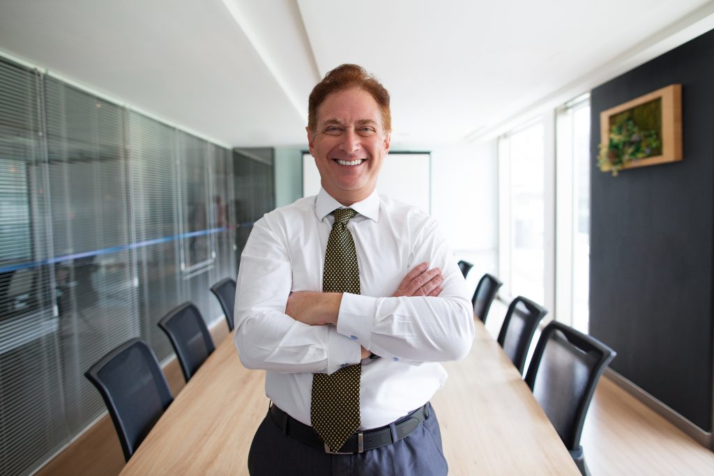 Closeup portrait of smiling middle-aged business man looking at camera and keeping his arms crossed in front of table in conference room. Front view.