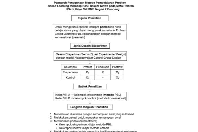Misalnya pada penelitian yang menguji efektivitas pembelajaran berbasis proyek. Sehingga sampel dibagi dua dan salah satunya diberi metode pembelajaran berbasis proyek dan sampel lainnya memakai metode konvensional. Efeknya pada nilai akademik akan menjadi hasil eksperimen. Berikut contoh desain penelitiannya: