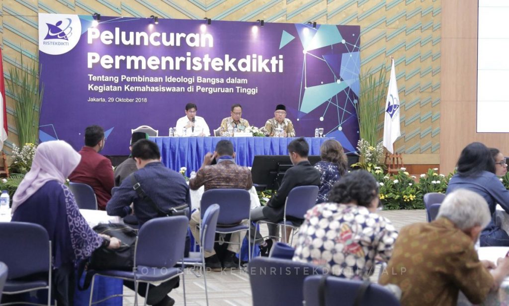 Jakarta – Bertepatan dengan Peringatan Hari Sumpah Pemuda, Menteri Riset Teknologi dan Pendidikan Tinggi (Menrisetdikti) menerbitkan Peraturan Menteri Riset, Teknologi, dan Pendidikan Tinggi (Permenristekdikti) Nomor 55 Tahun 2018, tentang Pembinaan Ideologi Bangsa dalam Kegiatan Kemahasiswaan di lingkungan kampus. Hal ini merupakan upaya Kemenristekdikti dalam menekan paham radikalisme dan intoleran di dalam kampus.