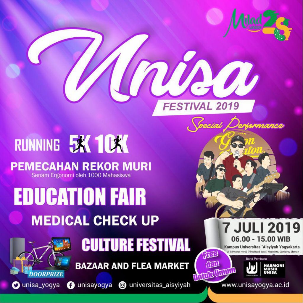 Kepala Biro Humas Unisa Yogyakarta Sinta Maharani dalam keterangan pers releasenya yang diterima redaksi duniadosen.com kemarin (27/6/2019) mengatakan, tema yang diambil dalam Unisa Festival 2019 kali ini diambil dari visi Unisa Yogyakarta sebagai kampus berwawasan kesehatan. Sehingga kegiatan yang digelar merupakan implementasi dari visi tersebut yang berupaya untuk selalu mengedukasi masyarakat tentang kesehatan salah satunya melalui sport dan culture.