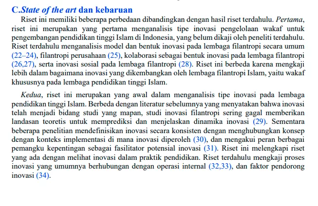 Tak hanya itu, berikut contoh lain dari kebaruan penelitian dari penelitian Skema Penelitian Dasar yang berjudul Inovasi Model Wakaf Kontemporer dalam Pengembangan Pendidikan Tinggi Islam dengan Pendekatan Analytic Network Process (ANP) yang telah berhasil didanai: