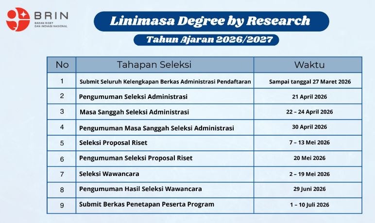 Informasi lebih rinci mengenai program Degree by Research (DbR) bisa mengunjungi website resmi yang dikelola BRIN. Berikut adalah timeline penyelenggaraan program DbR tahun 2026:
