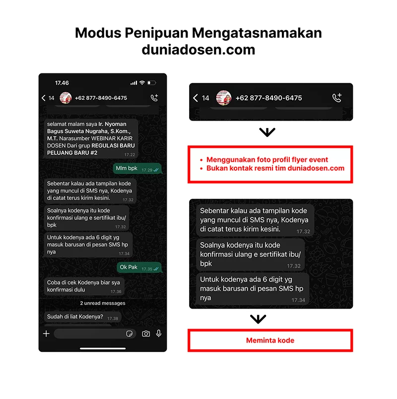 Penipu yang mengatasnamakan narasumber duniadosen.com meminta kode SMS dengan modus konfirmasi ulang sertifikat untuk menjalankan aksinya. Jadi, Anda wajib hati-hati apabila mendapatkan modus serupa karena Kami tidak pernah malakukan konfirmasi ulang e-sertifikat seperti di atas.