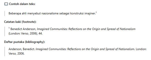 Sementara untuk sitasi dalam bentuk catatan kaki, penulisannya ada di bagian paling bawah di luar lembar teks. Biasanya jika ada catatan kaki, maka akan ada garis di atasnya untuk memisahkan lembar teks dengan tempat catatan kaki.