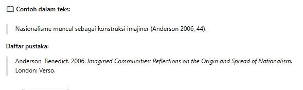 • Jika referensi dari media online, maka cukup menampilkan tanggal bulan dan tahun diakses tanpa menyebutkan sumber online‐nya.