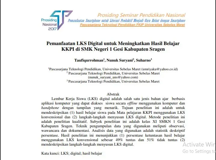 Artikel ilmiah yang terbit dalam bentuk prosiding disini adalah karya dari Taufiqurrohman, Nunuk Suryani, dan Suharno. Judulnya “Pemanfaatan LKS Digital untuk Meningkatkan Hasil Belajar KKPI di SMK Negeri 1 Gesi Kabupaten Sragen”.