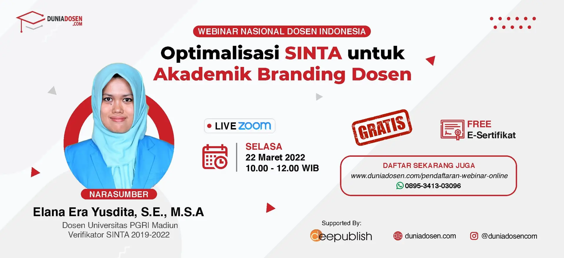 Pada 22 Maret 2022 lalu, Dunia Dosen berkesempatan mengundang Bu Elana Era Yusdita, S.E., M.S.A. untuk sharing kepada dosen lain dalam webinar yang berjudul “Optimalisasi SINTA untuk Akademik Branding Dosen”.