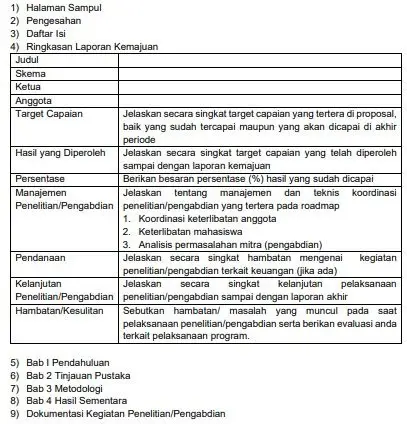 Sebagai bentuk persiapan menyusun laporan kemajuan maupun laporan akhir hibah penelitian. Berikut adalah contoh struktur laporan dalam template laporan hibah dari Universitas Brawijaya Fakultas Ekonomi dan Bisnis tahun 2025: